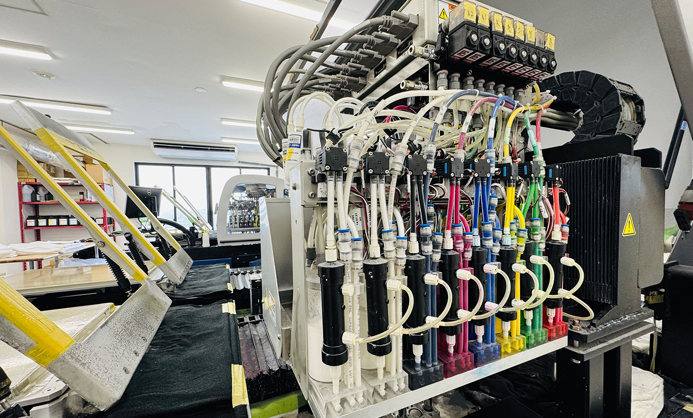 当社は、Tシャツをはじめとする繊維製品へのインクジェットプリントを得意としており、それに特化した独自の生産ラインを社内で構築しています。